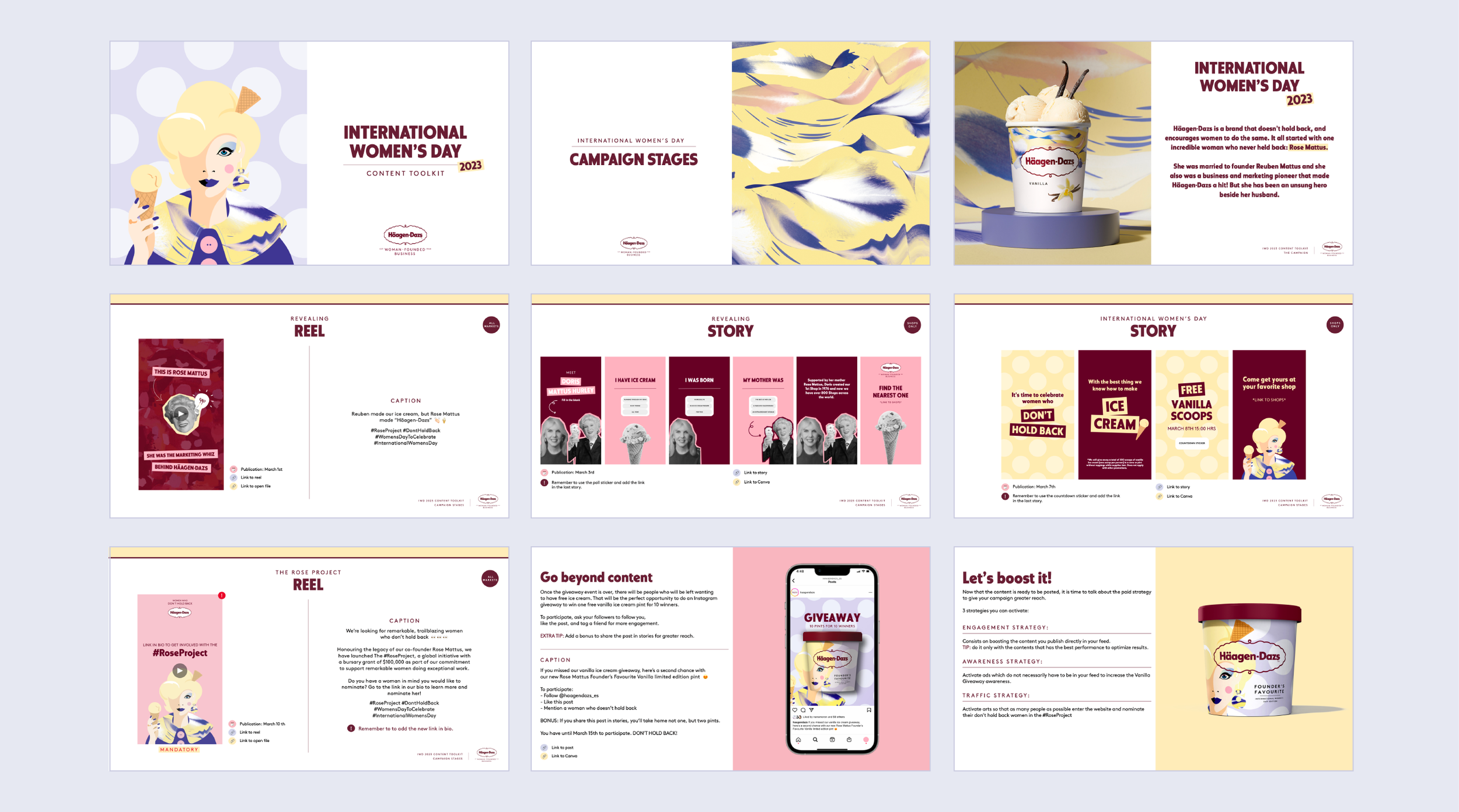 La campaña se inspiró en una ilustración de Rose Mattus proporcionada por el cliente, que se creó específicamente para esta campaña. La ilustración, junto con las directrices de la marca Häagen-Dazs, sirvieron de punto de partida para desarrollar una campaña visualmente impactante, femenina y moderna.